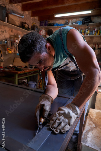 bricolage, instrument, blur, craftsman, skill, metalwork, garage, constructed, adult, condensed, manual, indoor, male, tied-up, racked, denim, looking down, glove, fit, workbench, occupation, metal, precise, muscular, artisan, process, hand-made, tool, workwear, wooden, steel, man, material, master, awl, measure, job, equipment, professional, repair, workshop, mark, sheet, sharpened, hobby