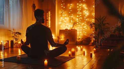 Man meditating at home, with candles and calming decor around