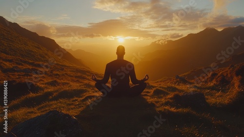 man, meditation, sunset, mountain, landscape, nature, yoga, peace, serenity, calm, calmness, spiritual, mindfulness, relaxation, solitude, harmony, balance, wellness, health, silhouette, golden hour, horizon, view, scenic, adventure, journey, freedom, escape, stillness, contemplation, sharpened, zen, person, pose, sitting, grass, hill, sky, cloud, light, sun, summer, vibrant, majestic, beautiful, awe