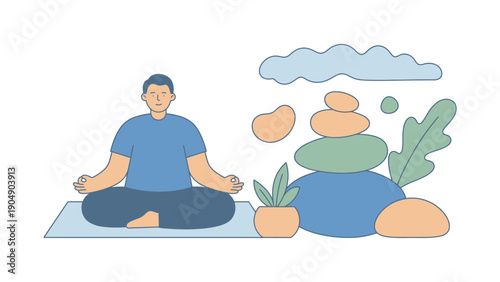 man, meditation, yoga, zen, peaceful, serene, calm, relaxation, mindfulness, male, adult, sitting, cross-legged, blue shirt, green plant, stone, rock, minimalist, illustration, vector, white background, isolated, meditating, inner peace, balance, harmony, nature, wellness, health, calmness, spa, therapy, anxiety, depression, mental health, breathing, exercise, flexibility, body, mind, soul, green leaf