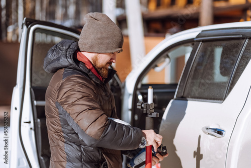man near the car collects measuring equipment for work on the land.