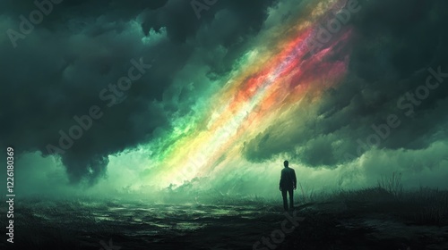 aurora, borealis, man, sky, storm, hope, colourful, vibrant, cloud, light, night, fantasy, surreal, magical, mysterious, dream, wonder, awe, landscape, nature, darkness, horizon, silhouette, person, alone, standing, dramatic, atmospheric, peaceful, serene, spiritual, energy, power, bright, colours, rainbow, texture, art, imagination, concept, background, design, illustration, digital, abstract