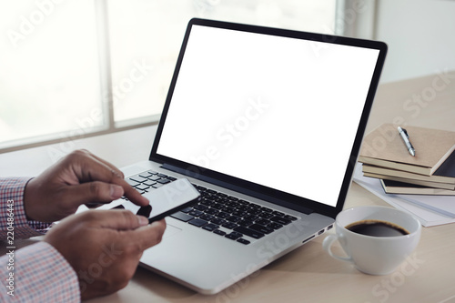 man of business man hand working on laptop computer blank white screen laptop on vintage wooden