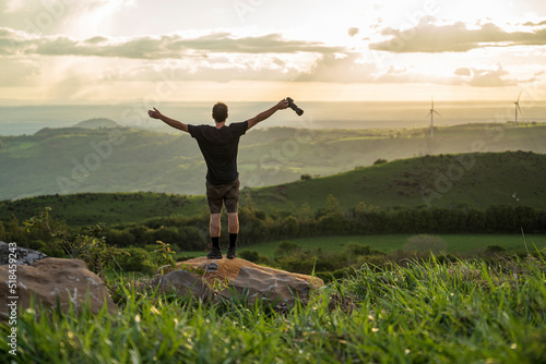 adventure, alone, appreciate, arm, back, camera, cloud, contemplation, copy space, costa rica, countryside, energy, enjoy, explore, freedom, fullness, grass, greenery, hand, horizon, landscape, mountain, nature, 1, open, outside, reflect, rock, scenery, short, sky, standing, sunlight, sunset, tour tourism, holiday maker, travel, up, vacation, victory