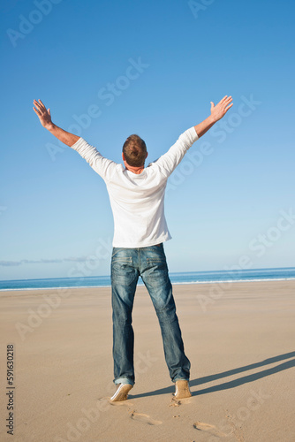 horizon, freedom, outdoors, daytime, free, caucasian, man, structure, life, holiday, human, alone, shore, vacation, beach, sea, coast, individual, image, back, european, casual attire, mature, person, trip, widener, carefree, place, living, picture, 1, photograph, french, humanity, outstretched, backview, france, water, liberated, tourist destination, copy space, clear sky, 50, attraction, baby boomer, 40