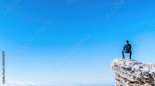 Man on mountaintop, enjoying panoramic view, clear sky, vast landscape; ideal for travel or adventure