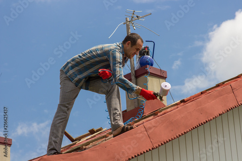 people, paint, work, industry, painter, spray, employment, profession, roofer, working, construction, compressor, constructor, labor, shopkeeper, coating, service, contractor, facades, security, industrial, repair, welfare, painting, decorating, colouring, magician, craftsman, labourer, coloured, device, architecture, employee, ladder, male, outdoors, standing, professional, equipment, sky