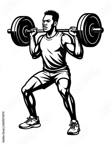 barbell, squat, weightlift, gym, man, training, posture, strength, fitness, leg, power, stance, muscle, activewear, isolated, cut-out, silhouette, ink, vector, bold, athletic, coordination, balance, core, endurance, dynamic, inked, t-shirt, short, motion, male, heavy, physical exercise, resistance, control, strong, lifting, bodybuilding, exertion, back
