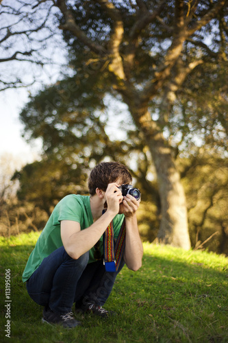 photographing, park, digital camera, outdoors, day, full-length, aspiration, photographer, us, california, hobby, casual clothes, t-shirt, brown hair, idea, tree, grass, enjoyment, crouching, sunlight