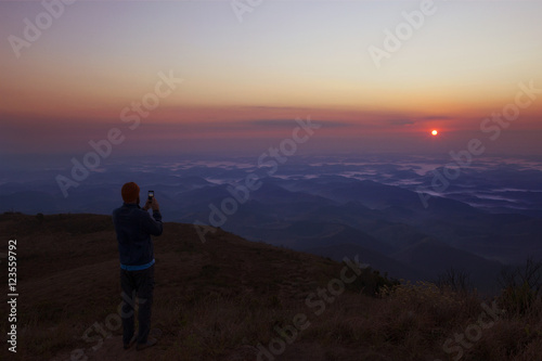 man, photographing, scenic, sunset, standing, mountain, mobile phone, lifestyle, communication, vacation, hiker, connection, nature, rock formation, warm clothes, sun, mountain ridge, calmness, observation point, holding, clear sky, copy space, winter, technology, brazil, remote, fog, hiking, get-away, weather, adventure, exploration, hobby, wireless technology, tranquil scene, environment, phone, orange, avocation, destination, backview, full-length, outdoors, one person, male