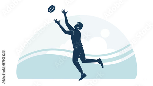 rugby, man, sport, athletic, action, play, game, ball, catch, jump, running, motion, dynamic, energy, excitement, competition, teamwork, fitness, exercise, outdoors, sportsman, athlete, physical, activity, rugby player, male, adult, one person, illustration, graphic, silhouette, blue, white, cloud, sunny