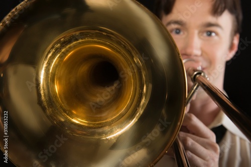 30s, adult, aged, background, black, blowing, brass, casual attire, caucasian, closeup, equipment, hobby, hobby, horizontal, indoor, instrument, isolated, jazz, leisure, lifestyle, looking, male, man, man, metal, middle, music, musical, musician, 1, people, percussion, percussionist, person, playing, portrait, practice, practicing, professional, skill, studio, talent, tone, trombone, tuning