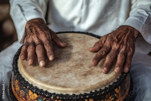 Man plays traditional Emirati percussion at a cultural gathering in the heart of the UAE, Man playing traditional Emirati drums percussion instrument, hands only in frame
