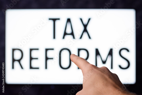 Man pointing to a screen with inscription TAX REFORMS in order to inform people about reforms