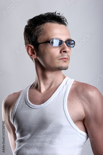adult, attractive, background, beautiful, beauty, boy, casual attire, caucasian, charming, cheerful, confident, cool, expression, eye, face, fashion, fashionable, fresh, goggles, grey, guy, hair, photogenic, happy, head, human, isolated, lifestyle, look, looking, male, man, masculine, man, model, modern, 1, people, person, portrait, pose, posing, serious, sexy, skin, smile, style, t-shirt, white, young