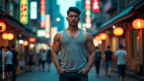 man, asian, street, lantern, neon, signs, night, city, urban, blur, people, walking, dark, casual attire, clothing, tank, top, arm, hand, pocket, blue, jean, light, red, orange, green, white, building, architecture, evening, background, portrait, pose, strong, muscle, torso, hair, face, beard, outdoors