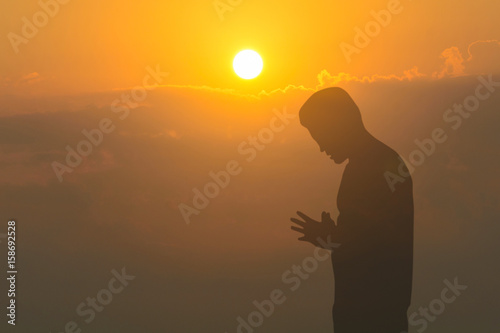 Man praying on cliff against sunset background