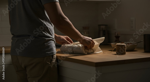 Man Preparing Deliciously Wrapped Snacks At Home Kitchen Counter During Evening Cooking Session With Soft Lighting Atmosphere