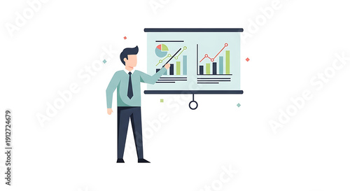 Man presenting business data on a screen with graphs and charts