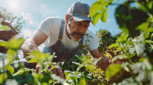 Man pruning plants in his garden on a sunny summer day, low-angle shot, enjoying gardening as a hobby