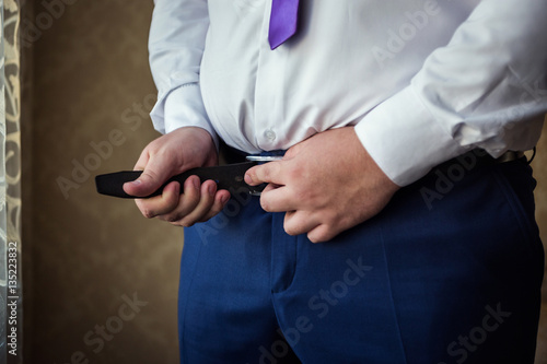 man putting on a belt, Businessman, Politician, man's style, male hands closeup, American businessman, European businessman, a businessman from Asia, People, business, fashion and clothing concept