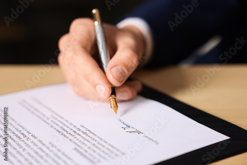 Man putting signature on document at table, closeup