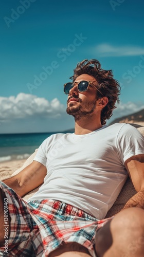 Man Relaxing on Beach Wearing Sunglasses and Shorts