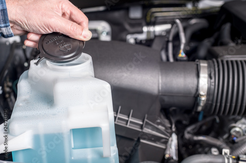 Man removes the plastic cap from the windshield washer fluid container in a truck