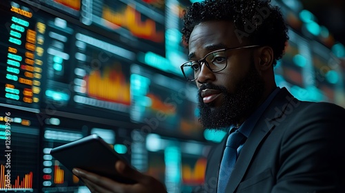 man, male, person, adult, businessman, professional, trader, investor, finance, financial, datum, technology, tablet, device, screen, monitor, display, chart, graph, number, statistic, market, stock, trading, business, work, office, analysing, reviewing, studying, information, digital, modern, goggles, beard, dark, night, serious, focused, concentrated, attire, suit, attaching