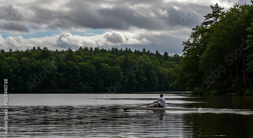 Man rowing boat on lake with forest background under cloudy sky and sun rays.