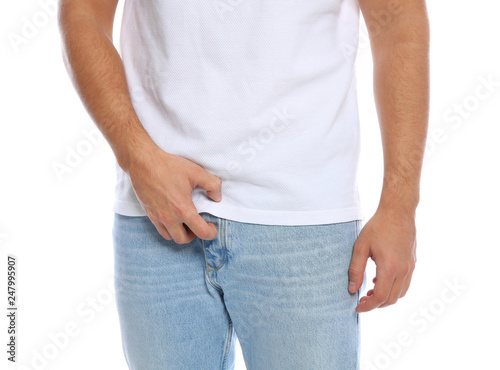 Man scratching crotch on white background, closeup. Annoying itch