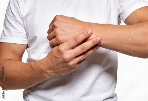 man, person, arm, hand, itch, scratch, skin, white, t-shirt, health, medicals, discomfort, irritation, hygiene, care, wellness, health care, skincare, body, human, isolated, closeup, detail, studio, plain, background, white background, scratching, itchy, body part, adult, male, caucasian, nobody, indoor