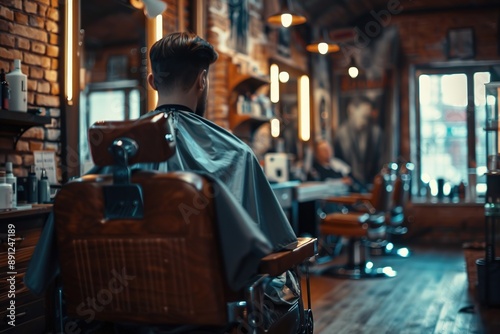 barbershop, man, chair, vintage, mood, lighting, interior, coiffure, grooming, salon, hair, client, style, retro, fashion, care, male, shop, atmosphere, haircut, waiting, wooden, brick, wall, mirror, equipment, comfort, relaxation, elegance, personal, service, pampering, maintenance, trendy, culture, traditional, cosiness, antique, furnishing, ambience, life events, urban, client, seated, stylish