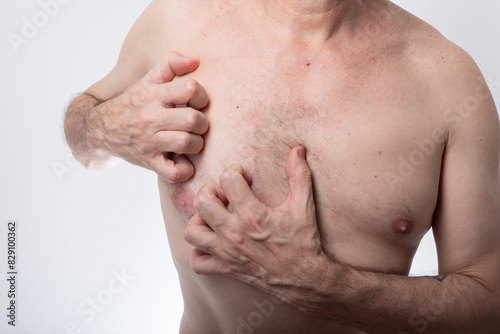 Man, shirtless, scratching his chest. Allergic reaction. Skin disease. Dermatology.