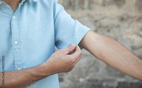 Man showing summer shirt with short sleeves.