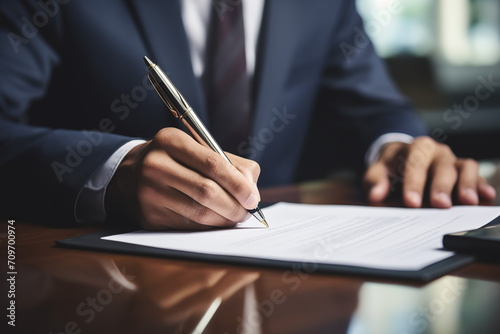Man signing an official document. Close up businessman with pen in hands, ready signing paper, executive manager, Generated AI