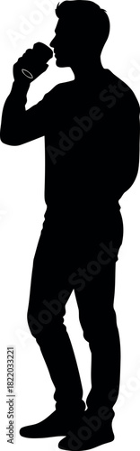 silhouette, man, drinking, hot drink, cup, beverage, drink, hot, morning, break, refreshment, casual attire, standing, isolated, white, background, black, and, male, person, lifestyle, enjoyment, relaxation, warm, aroma, caffeine, mug, art, minimalist, studio