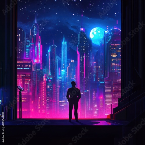 man, silhouette, city, futuristic, skyscraper, neon, night, city landscape, building, light, pink, purple, blue, window, view, urban, scene, technology, architecture, modern, science, fiction, fantasy, design, art, illustration, digital, painting, graphic, style, aesthetic, vibrant, colours, cosmic, moon, star, space, atmosphere, dark, shadow, contrast, glow, energy, future, dreamlike, surreal, perspective, lonely