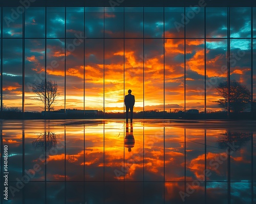 sunset, sunrise, man, silhouette, window, building, orange, red, cloud, sky, floor, glossy, vibrant, colours, view, landscape, scene, image, photo, picture, artwork, art, modern, contemporary, minimalist, dramatic, awe, inspiring, peaceful, tranquil, serene, calm, solitude, contemplation, hope, future, ambition, success, achievement, perspective, opportunity, dream, aspiration, vision
