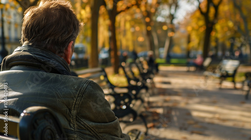 Man sitting alone on park bench with worried expression, surrounded by empty benches, capturing loneliness and uncertainty of unemployment