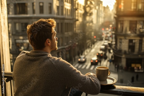Man sitting on a balcony overlooking a bustling city street, half-body shot, enjoying a quiet moment with a coffee, relaxed holiday vibe, warm afternoon light, thoughtful expression, urban backdrop