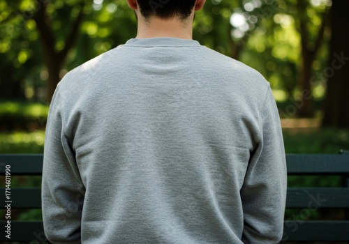 Man sitting on a park bench seen from behind. Back of person in gray sweatshirt outdoors, concept of leisure and contemplation.