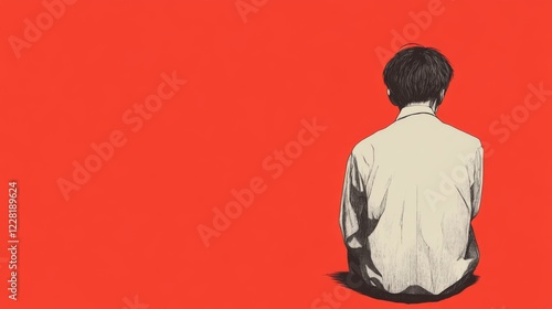 man, sitting, back, view, red, background, alone, person, male, human, posture, solitude, isolation, loneliness, pensive, thoughtful, contemplative, mood, emotion, feeling, sorrowful, despair, depression, anxiety, stress, worry, concern, problem, difficult, challenge, struggle, hope, future, uncertainty, life, existence, minimalism, simple, graphic, art, illustration, design, drawing, vignetting, style, contemporary, modern