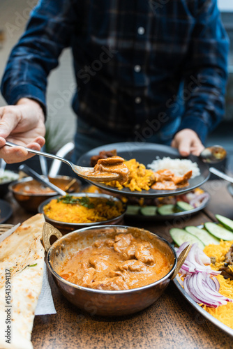 Man spooning curry on to his plate at an Indian Restaurant in Australia