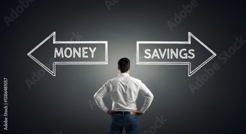 man, money, savings, arrow, choice, direction, business, financial, investment, career, strategy, businessman, decision, opportunity, success, future, economy, growth, profit, finance, wealth, planning, banking, funds, loan, market, stock, asset, income, be of use, return, risk, management, concept, achievement, challenge, leadership, corporate, blackboard, background, standing, rear, option, goal