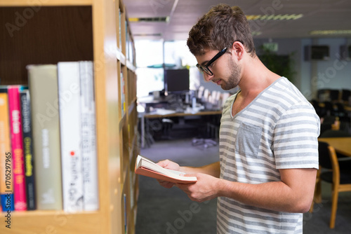 Man standing by bookshelf in library holding open paperback and reading next to computer monitors