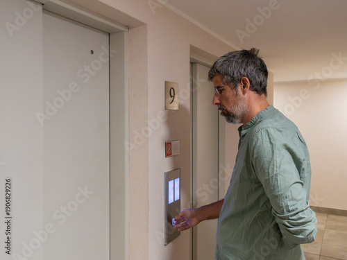 man, pushing, buttons, elevator, waiting, corridor, apartment, building, calling, pressing, hand, transport, accessibility, convenience, vertical, movement, bearded, goggles, adult, person, modern, architecture, urban, indoor, looking, grey hair, lifestyle, travel, going up, technology, simple, process, residential, journey, communication, action, closeup, indoor, standing