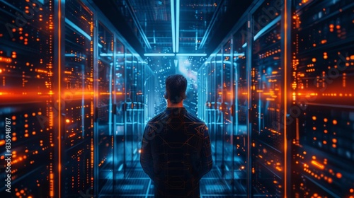 Man standing in a futuristic data center surrounded by glowing servers and advanced technology, representing modern digital infrastructure.