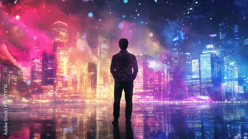 city, neon, night, light, silhouette, man, urban, watercolor, colourful, wet, surface, skyline, futuristic, modern, city landscape, building, glow, street, artistic, atmosphere, digital, fantasy, metropolis, abstract, background, technology