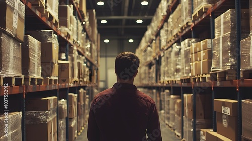 man, warehouse, storage, inventory, shelf, box, pallet, logistic, distribution, industry, business, work, employee, men at work, hard work, factory, mill-hand, industrial, manufacturing, commercial, shipping, receiving, production, packing, unpack, retail, wholesale, commerce, e-business, economy, businessman, entrepreneur, startup, workplace, job, career, professional, stock, stockroom, backview, looking, walking, aisle